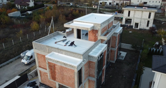 Arhitectura complexă a locuinței a necesitat o soluție cu performanță ridicată, iar sistemul TPO instalat de Technobuild asigură protecție și durabilitate pentru zeci de ani.